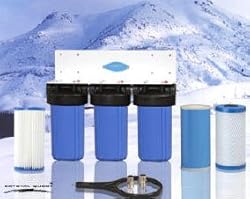 Big heavy-duty 10"x5" Whole House Water Filter for high flow applications. This big blue filter with three cartridges will remove hundreds of contaminants from water, while providing an adequate water flow. This filter has 3 10"x5" water filter cartridges that are designed for high-flow water filtration applications. Unique, wide cartridges are capable of filtering enough water for a large house, apartment or busy office. Triple High-Flow Whole House Filter features: * First Filter Cartridge is a 10" sediment filter cartridge that removes sediment, silt, sand and dirt. This cartridge also extends life of other, more expensive cartridges and prevents damage * Second Filter Cartridge is a multi-stage filter that consists of one micron filter pad, KDF55, KDF85, Ceramic Balls, Granular Activated Carbon (GAC), and another 1-micron pad. This filter will remove hundreds of contaminants from water * Third Cartridge is a 10"x5" solid carbon cartridge for removing volatile organic compounds (VOCs), insecticides, pesticides and industrial solvents Whole House Filter Technical Specifications * Compact design, easy filter cartridge changes * Pressure release Valve * Wall Bracket * Available in 1/2" 3/4", 1" NPT input/output (please specify when ordering) * Filter Life: 80,000 gallons