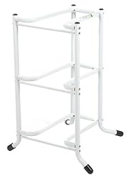Ideal for home or office use, this sleek three-tier caddy offers a space-saving and efficient way to store up to three 5-gallon jugs of fresh drinking water, ready for loading into a water-dispensing system. The unit's tubular, steel-framed construction features a gleaming, powder-painted white finish, with reinforced crossbars that lend stability and keep bottles securely in place. Even more, its open shelves afford easy accessibility when loading and unloading jugs, while its trim silhouette and vertically stacked design maximize storage space in pantries, closets, and other tight settings. Mounted upon short, splayed feet that prevent tipping and suspend it safely above the ground, the unit's protective rubber feet prevent scratching and damage to hard-floor surfaces. All necessary hardware and simple assembly instructions come included. The water-bottle caddy measures 19 by 18 by 29 inches.