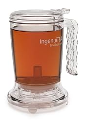 Great for the office or when traveling, this innovative teapot releases infused tea into a drinking cup. When tea is ready, simply place it atop the cup, causing a valve at the bottom to release and crystal-clear tea to flow down. A mesh filter retains all the leaves with one of the best infusers on the market. Dishwasher and microwave safe, the teapot is made in Taiwan of food-grade plastic. It holds up to 16 ounces and has an easy-grip handle.