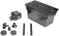 Add a pump, fountain, and filter to your pond at once using the Beckett Professional Filter and Fountain Kit. This kit contains all you need to begin effectively filtering your pond water. Place the included 210 gph pump inside the filter box, and surround it with the biological media balls. These media are covered in spokes of differing heights, offering several crevices for biological bacteria to establish a colony. The coarse and fine filter mats that cover the pump act as a macrofilter, keeping debris from nearing your pump. The lid of the box has a fine screen as well, to allow water in but prevent large debris from entering the unit. This specially designed kit also features risers and two different fountain heads, so you can choose to add a more dramatic feature to your water garden. Choose either the three tier or flower shaped fountain head, and attach it to the top of the riser. Open the diverter valve to power just the fountain, or alter it to power both a fountain and spitter or other small water feature. Use only one riser for a smaller fountain or bubbler. This unit is best suited for filtering ponds up to 350 gallons, and is designed for use in ponds approximately 18 inches deep. The black color and compact size will remain unobtrusive. Essential for fish and plants. Kit includes three tier fountain nozzle, 1440 diverter valve with flow control, and two extension tubes (for waterfall attachment), pump, biological media balls and 20 foot power cord.