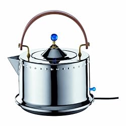An electric version of the original Ottoni Stovetop Kettle, this compact cylindrical kettle boasts the same sparse post-modernist 70s design with whimsical touches such as the mystical blue-beaded lid handle and a row of raised dots hammered into the steel around its upper circumference. However, the kettle also has a function: its slightly wider base directs heat upward so water boils faster than in other kettles. Even more, its stainless-steel heating element sits below a stainless-steel plate to ensure maximum surface contact between the hot metal and water. The kettle quickly and efficiently boils up to 51 ounces of water for tea, hot cocoa, and more. For safety, its automatic shut-off function turns the unit off once the water boils or if the heating element overheats. Other highlights include a durable plastic loop handle, a lift-off lid for easy refilling, and a removable scale filter in the spout for better-tasting beverages, as well as a base unit for cordless operation, a simple on/off switch, and brilliantly polished stainless-steel construction that will nicely compliment any kitchen decor. To clean, wipe the outside of the kettle with a damp cloth and descale as needed. The fully automatic electric water kettle measures 10-1/2 by 10-1/2 by 7-4/5 inches and carries a two-year warranty.