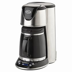 With its beautiful, easy-to-use design, this 5-cup automatic drip coffeemaker brews great-tasting coffee and nicely compliments any kitchen decor. The unit's thermal-insulated stainless-steel and carbon-fiber carafe functions not only as an attractive serving piece, but it also keeps 40 ounces of coffee hot for up to five hours. The coffeemaker offers a push-button control panel, with a digital display and blue LED indicator lights, which allows for simple programming of the automatic timer. The unit's pause-and-serve function makes it easy to pour a quick cup midbrew, and at the end of the brewing cycle, the appliance automatically shuts off for safety. Other highlights include a 40-ounce top-filling water reservoir, a top-loading filter basket with a removable internal basket for easy coffee loading and removal, and cord storage to help keep countertops tidy. As needed, wipe the exterior of both the thermal carafe and the coffeemaker with a damp cloth, then dry thoroughly. The inside of the thermal carafe and all removable parts of the coffeemaker should be washed by hand in soapy water, rinsed thoroughly, and dried. The coffeemaker measures 12 by 8-1/4 by 14-1/2 inches and carries a one-year limited warranty.